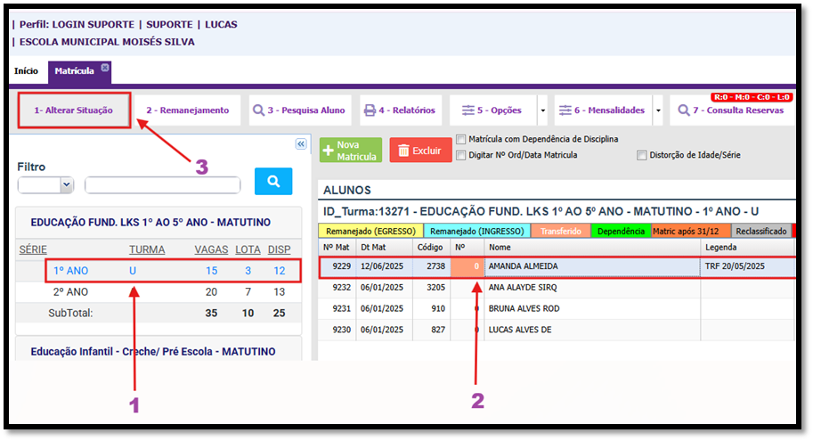 Neste artigo será demonstrado como estar realizando a transferência do aluno para escolas do mesmo município: 1. Para iniciar abriremos o menu Secretaria e selecionar a opção Matriculas. 2. Após ter aberto as matrículas, siga os passos abaixo para ...