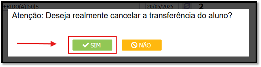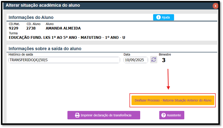 Assim, o processo de desfazer a transferência do aluno será concluído, mantendo-o na turma em situação normal.