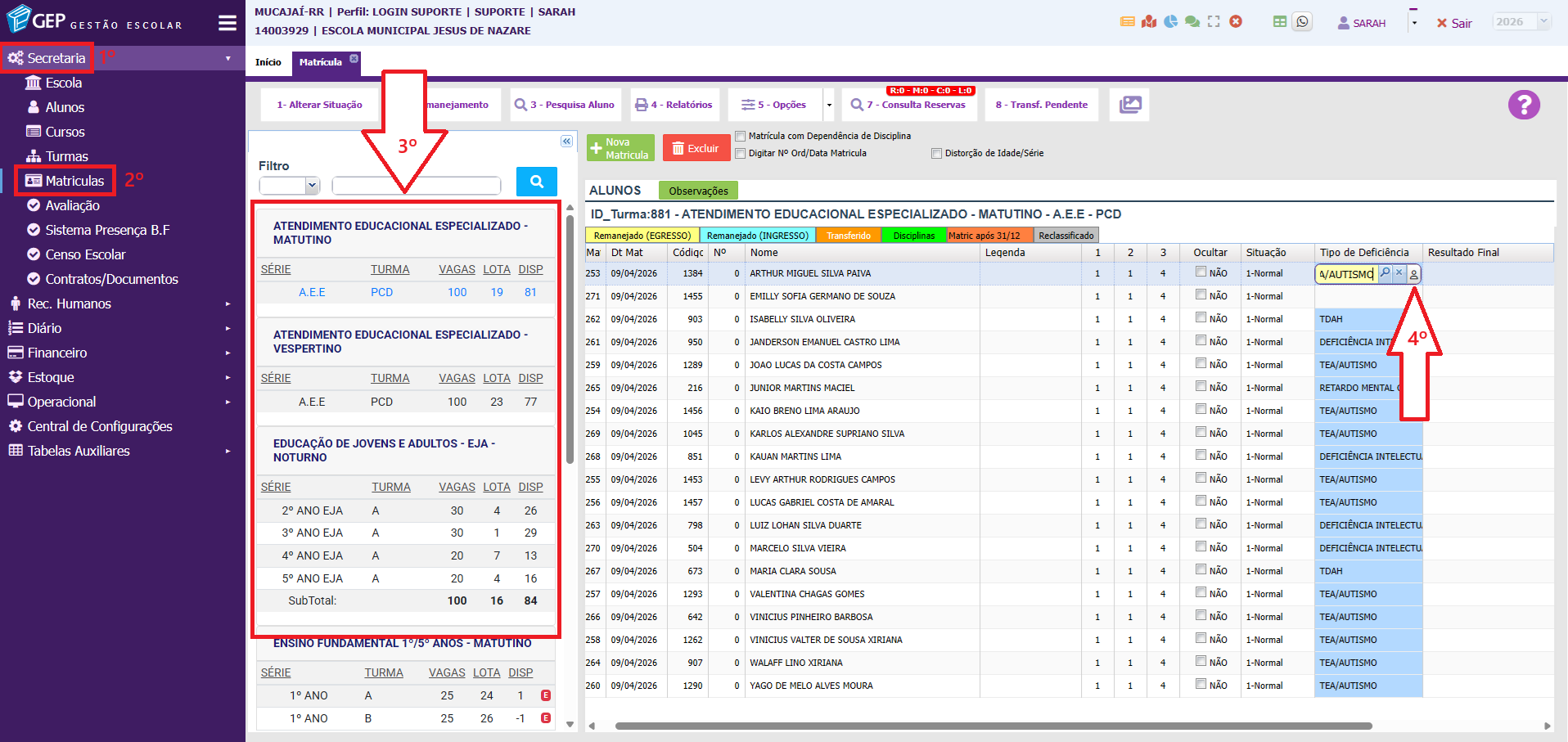 1. Acesse o módulo de matrículas, no Menu Secretaria. Selecione a turma que consta o(s) aluno(s) que você irá definir a forma de avaliação. Em seguida, clique na deficiência informada e depois no ícone do boneco.
