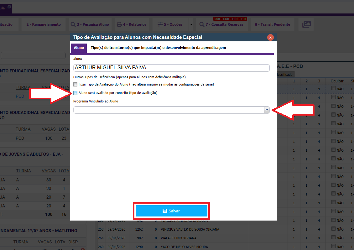 2. Nessa janela você irá marcar a caixa que informa que o aluno será avaliado por meio de conceitos e abaixo você deve selecionar qual programa de habilidades será utilizado para isso. Por fim, clique em salvar.