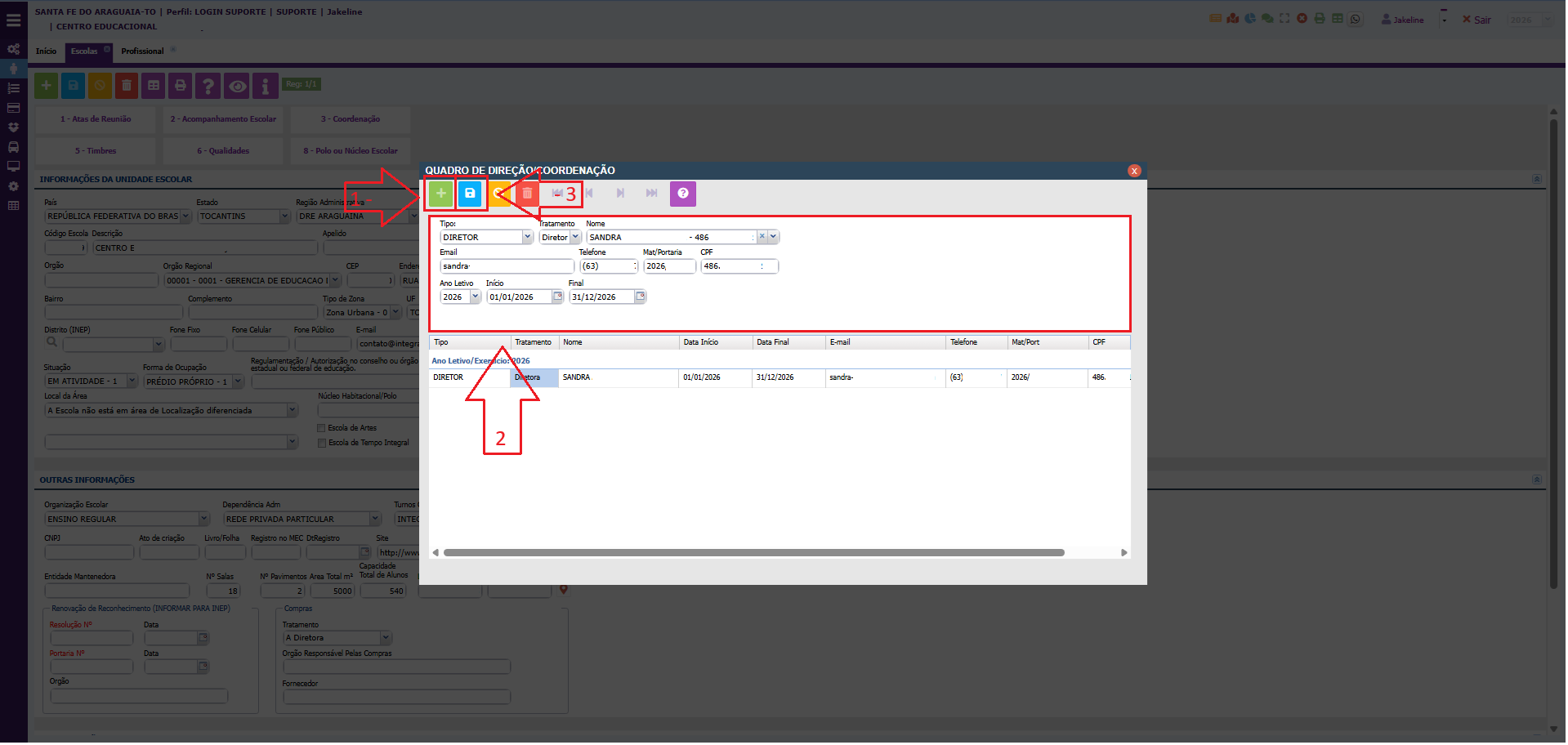 2. Na tela QUADRO DE DIREÇÃO/COORDENAÇÃO siga os passos: