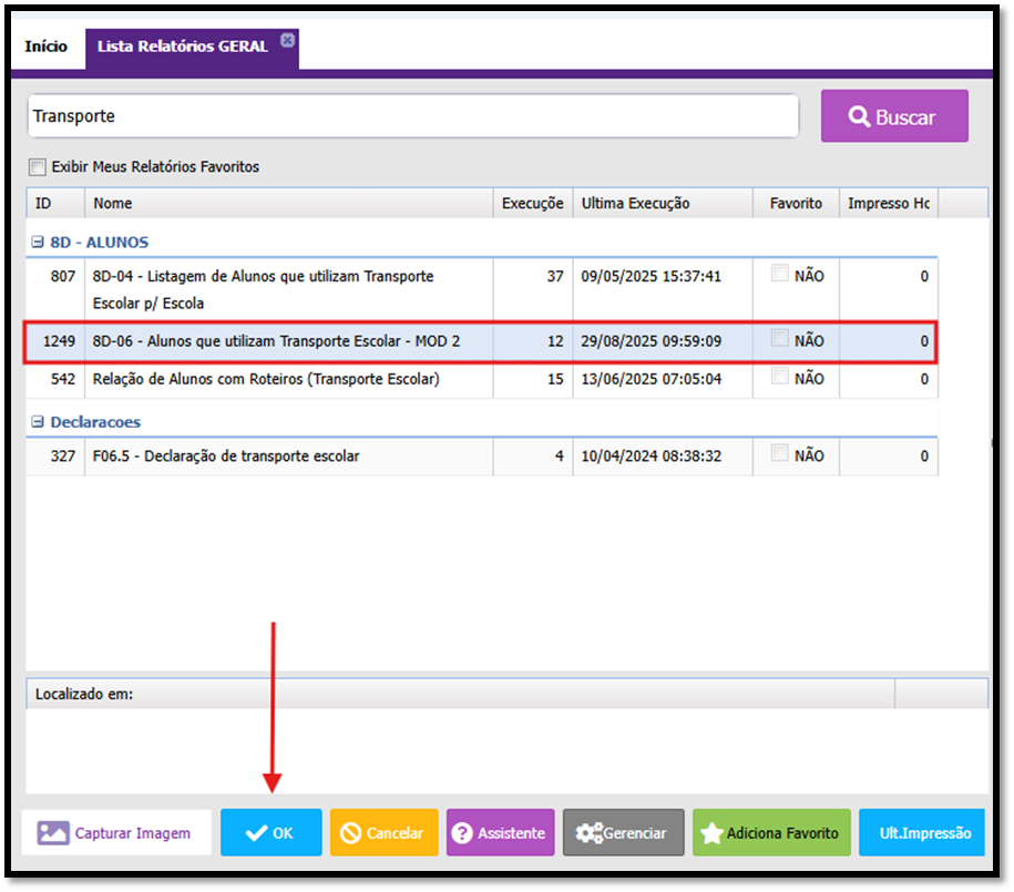 3 - Após buscar o sistema ixibirá a relação de relatórios de acordo com a pesquisa, selecione o desejado e clique em OK.