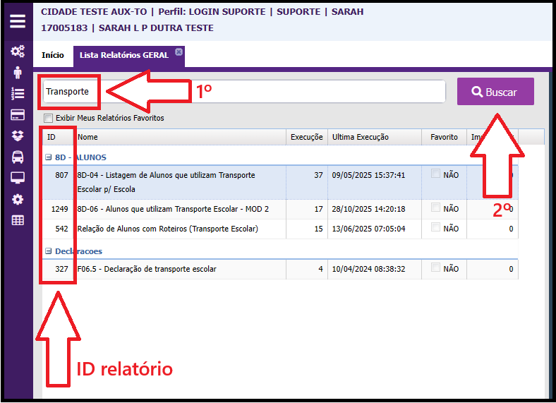 Palavra chave - Nome do relatório! Ex: TRANSPORTE informando esse nome o sistema irá buscar todos os relatórios relacionados à palavra informada.