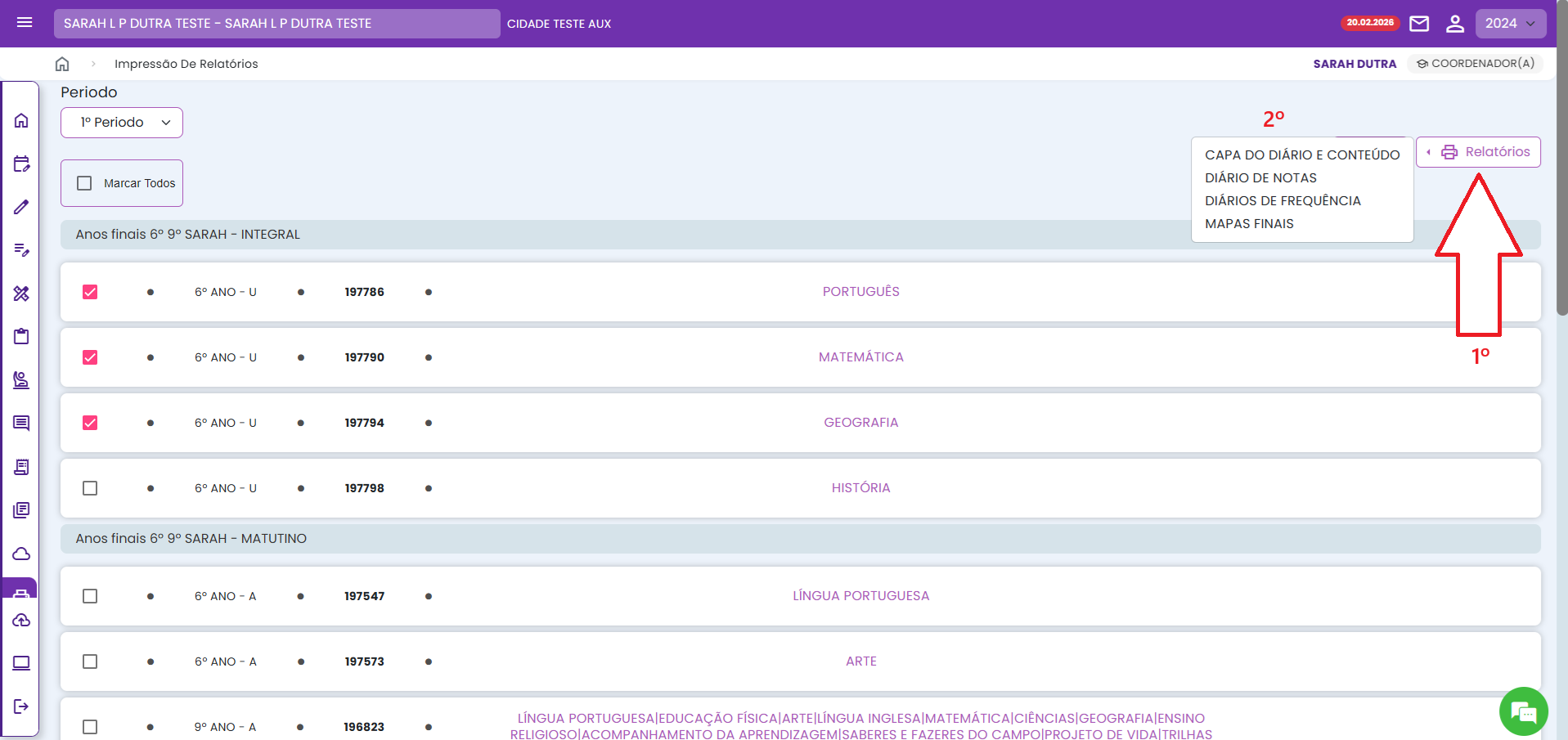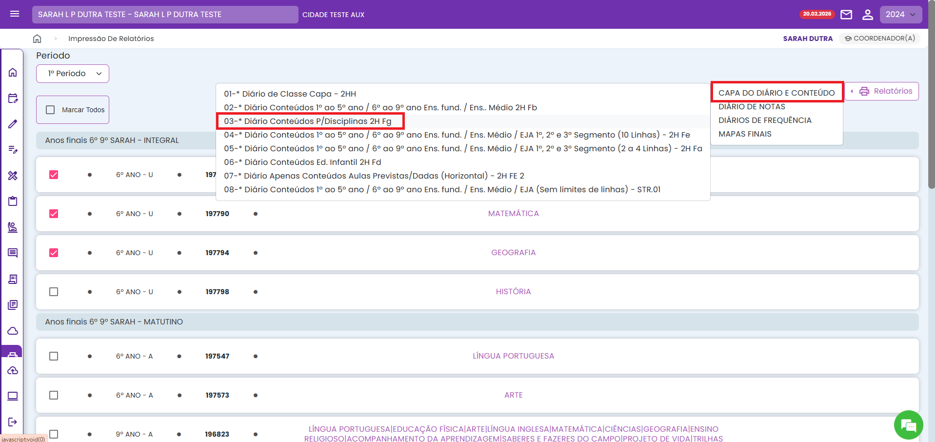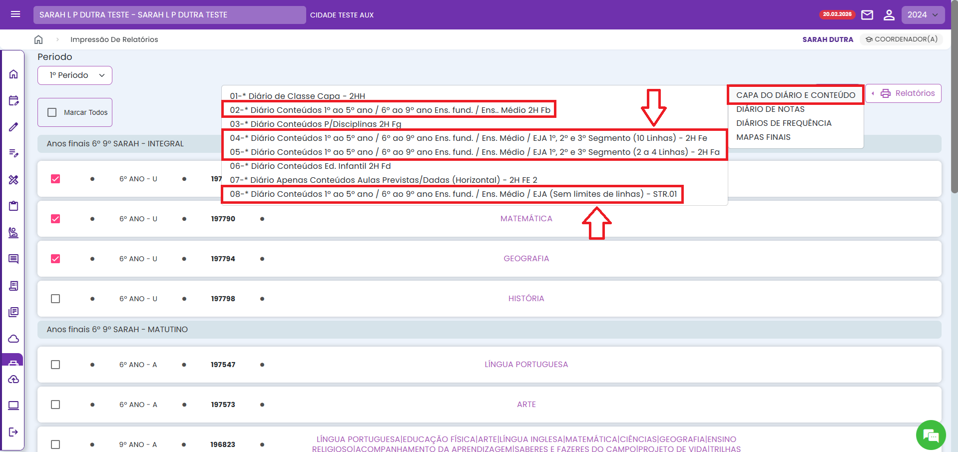 4. Após marcar os diários, no botão RELATÓRIOS, selecione o tipo de diário que você deseja imprimir e depois o relatório adequado.