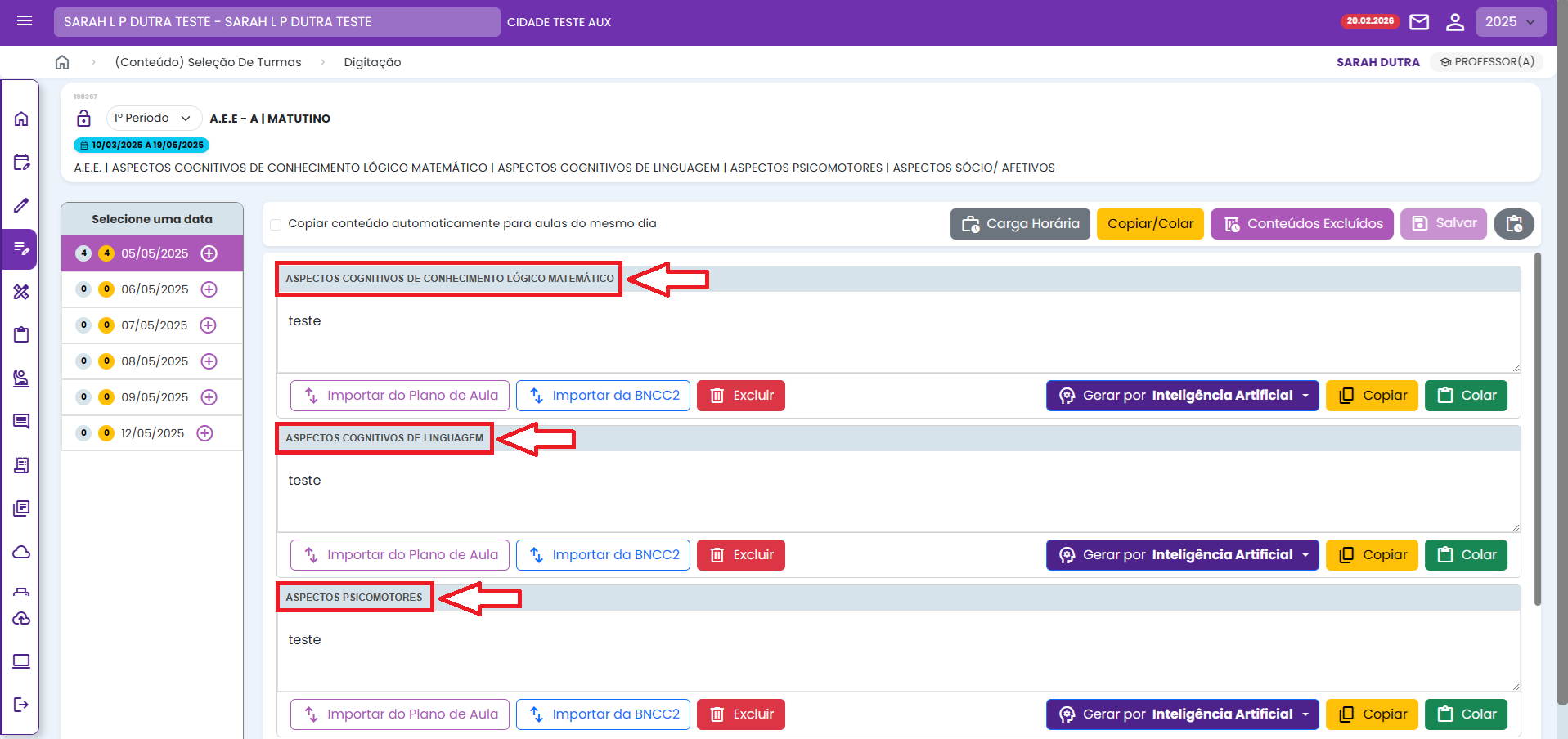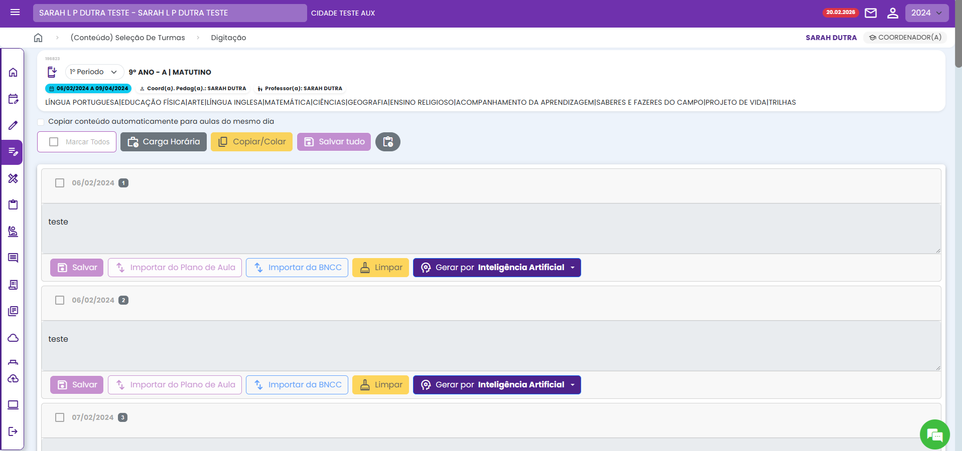 A- Diário "Conteúdo por disciplina" - Diários agrupados que possuem campos específicos de cada disciplina para digitação do conteúdo.