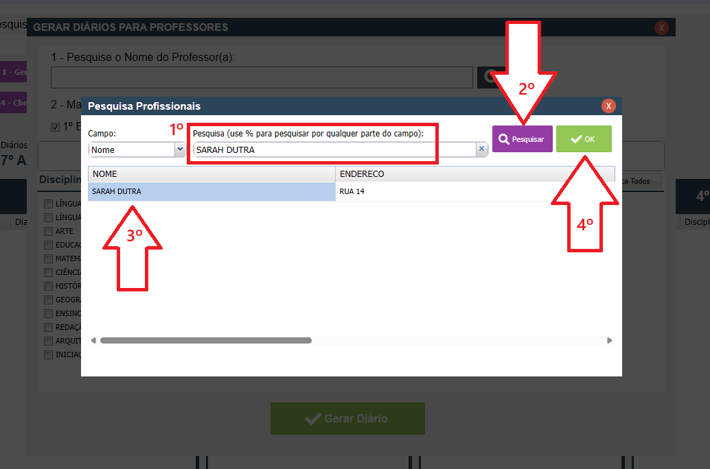 2º - Digite o nome, clique em PESQUISAR, ao localizar o professor correto, clique no nome dele e em seguida em OK.