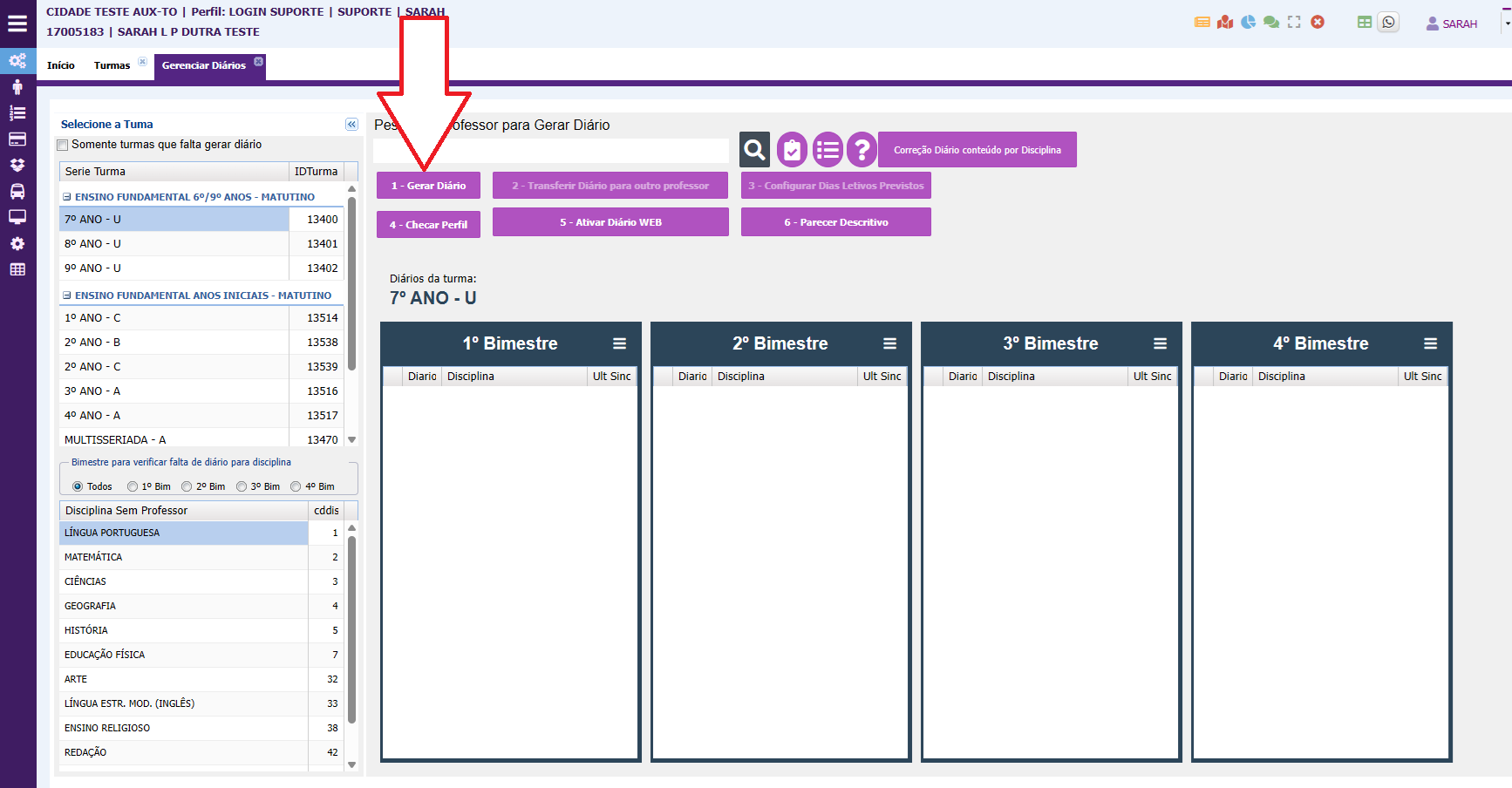 2. Após identificar a turma, clique no botão 1- Gerar diário.