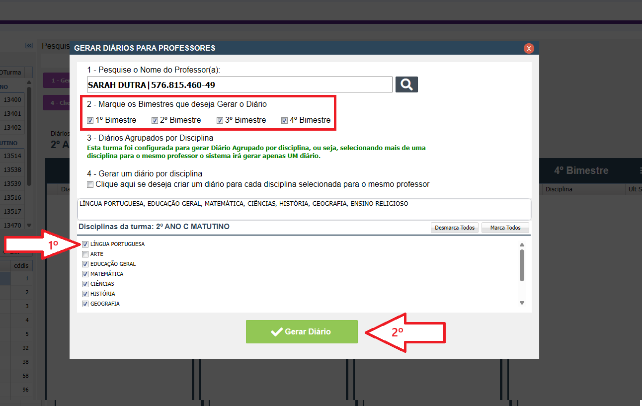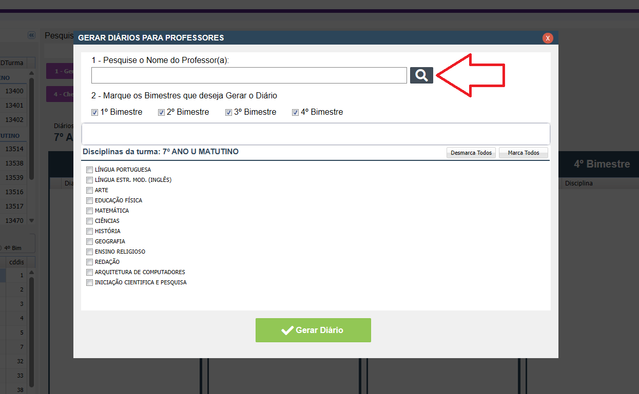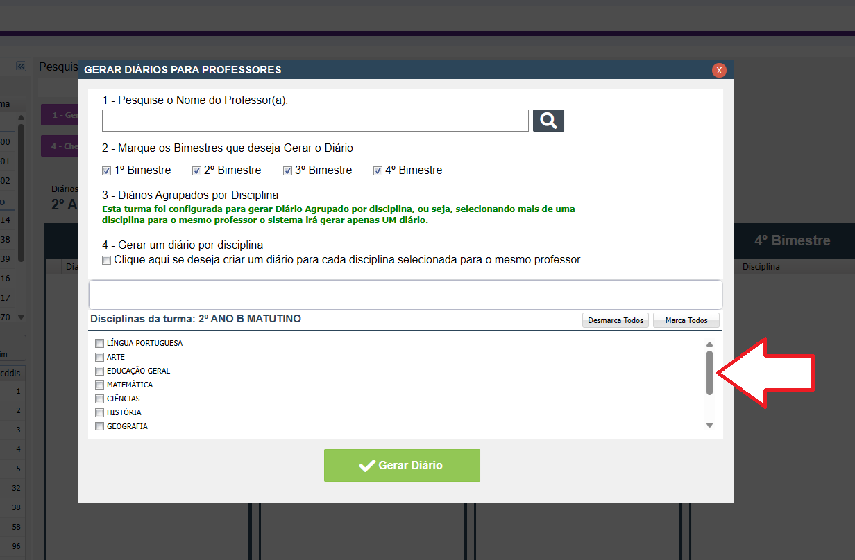 3º - Marque a(s) caixa(s) correspondentes à(s) disciplina(s) que o professor trabalha. E por fim, clique em GERAR DIÁRIO.