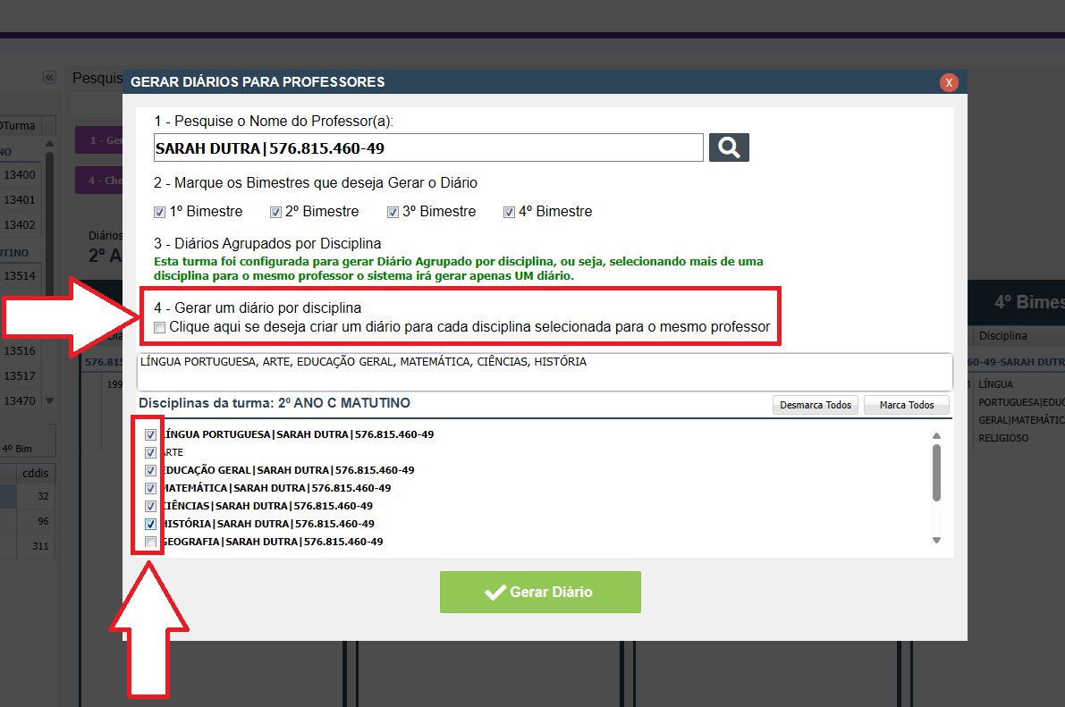Caso você precise gerar diários separados, mas o professor tem mais de uma disciplina, marque a caixinha da opção 4 antes de gerar o diário.