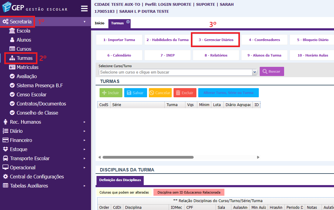 1. Acesse Menu Secretaria, módulo de turmas. Depois, clique no botão 3- Gerenciar diários.