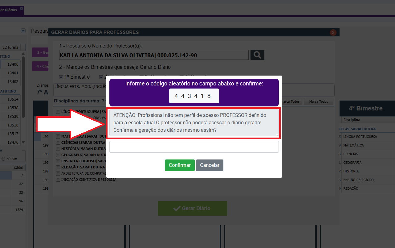 É possível que após clicar em gerar diário, apareça a mensagem abaixo. Nesse caso, você vai precisar definir o perfil de acesso para esse profissional.