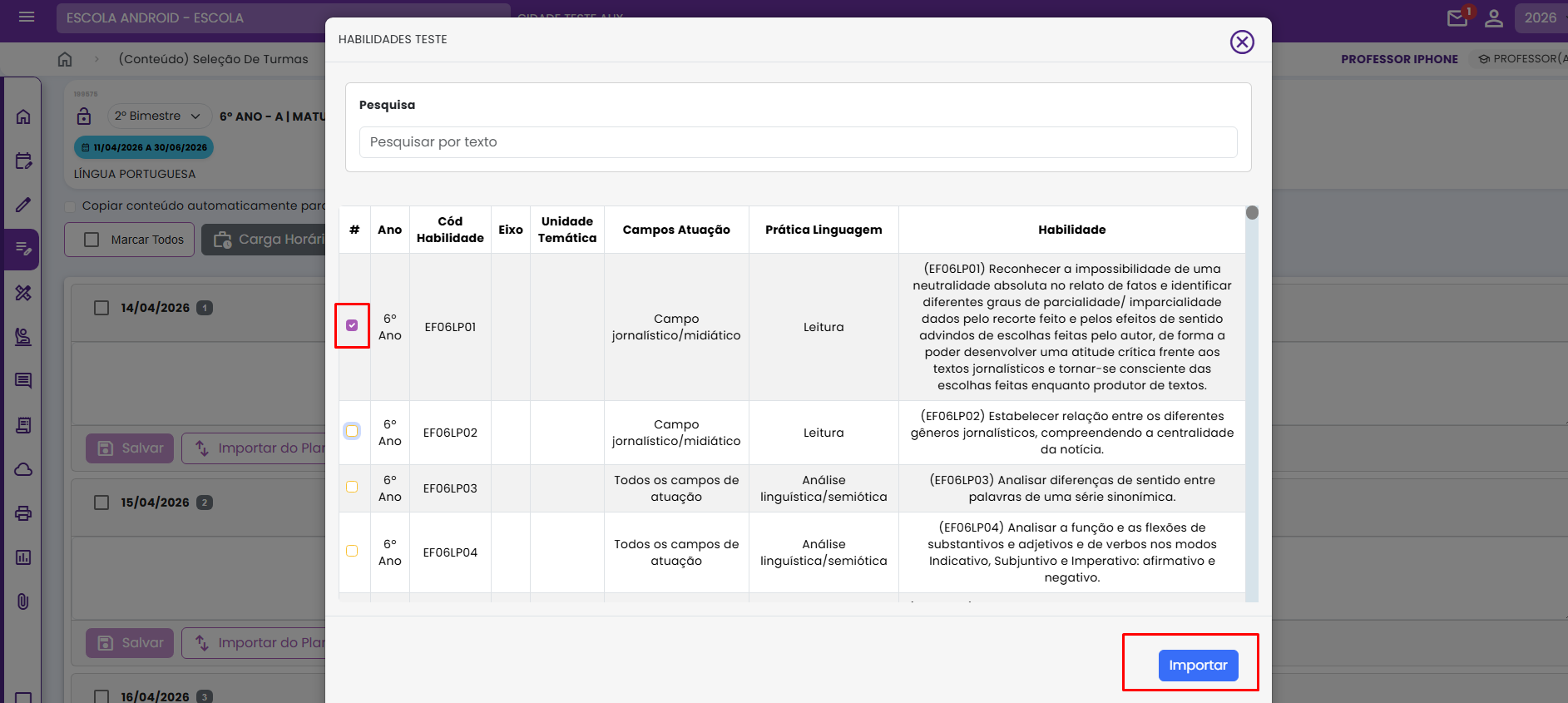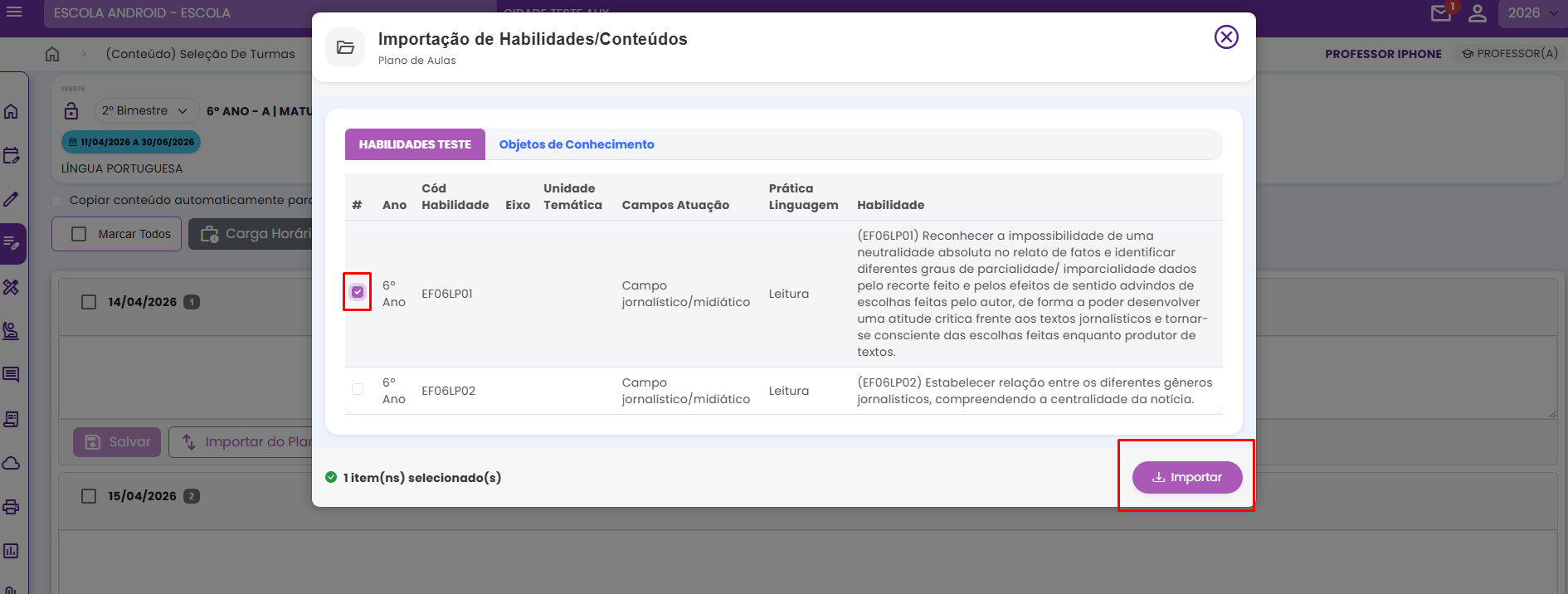 4. Ao clicar em “Importar do Plano de Aula”, será exibida a janela “Importação de Habilidade/Conteúdo – Plano de Aulas”. Nela, basta selecionar o item desejado e clicar em “Importar”.