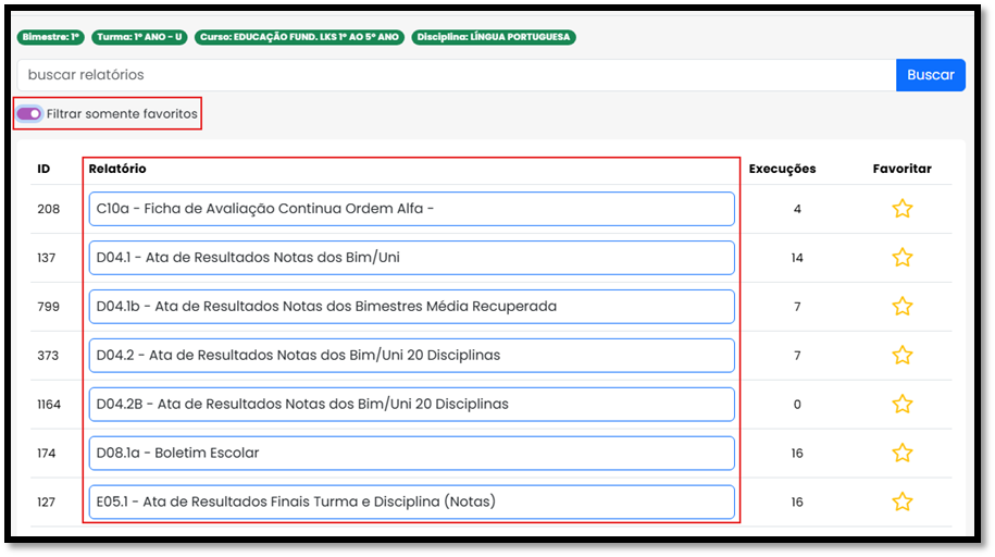 3 - Busque pelo relatório desejado. Para facilitar futuras consultas, defina os relatórios mais utilizados como favoritos. Assim, ao clicar em 'Exibir meus favoritos', serão exibidos apenas aqueles que você marcou como favorito.