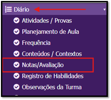 1 - Ao acessar o sistema, clique no menu DIÁRIO e selecione a opção NOTAS / AVALIAÇÃO.