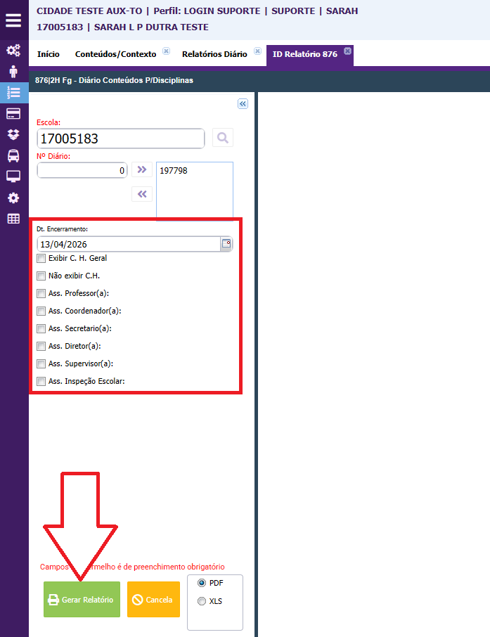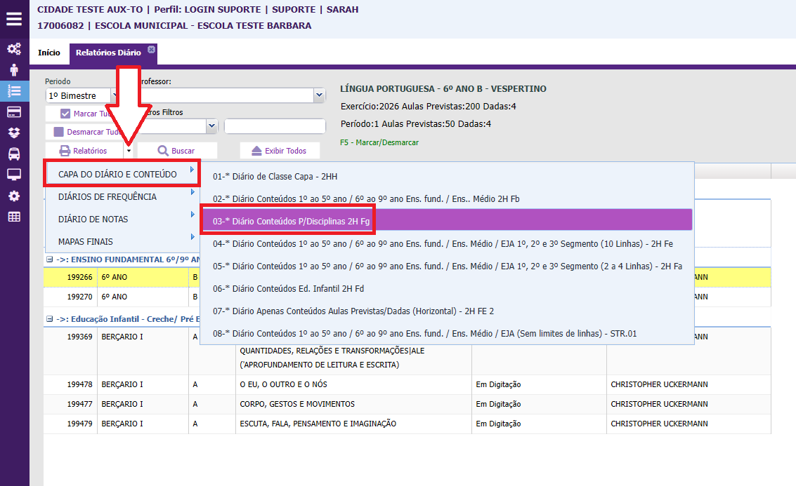 - Selecione o relatório 03 —*Diário de conteúdos P/Disciplinas