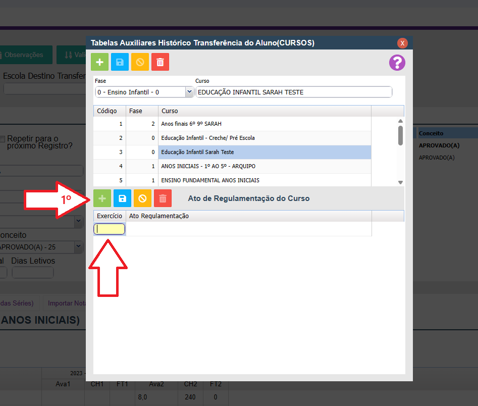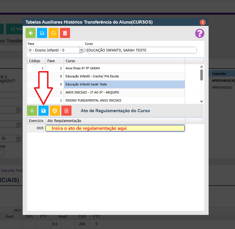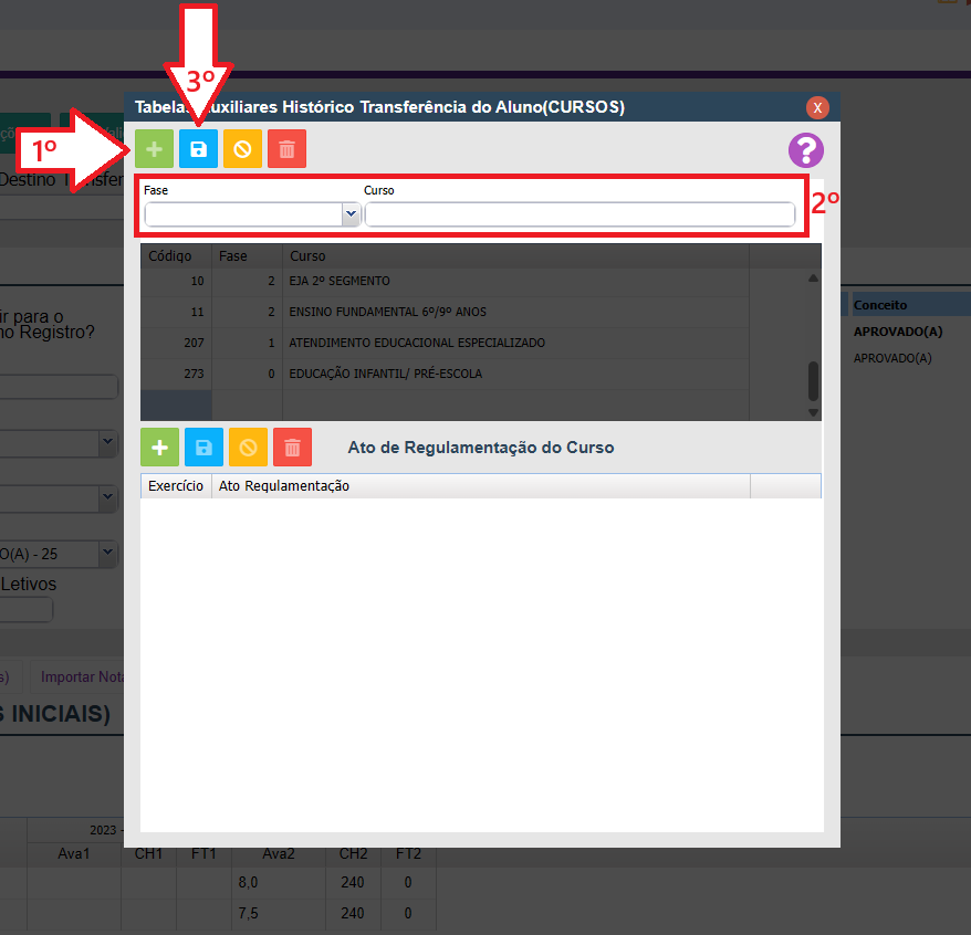 indicado abaixo e preencher a FASE e o CURSO. Depois de preenchido, não esqueça de salvar clicando no botão