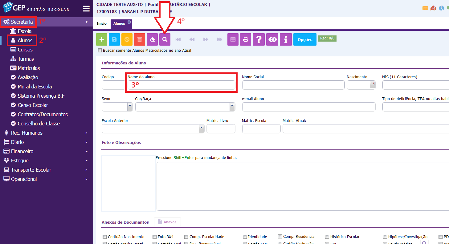 1. Primeiramente clique no menu secretaria e selecione o módulo de alunos. Quando estiver no módulo, digite e busque o nome do aluno.