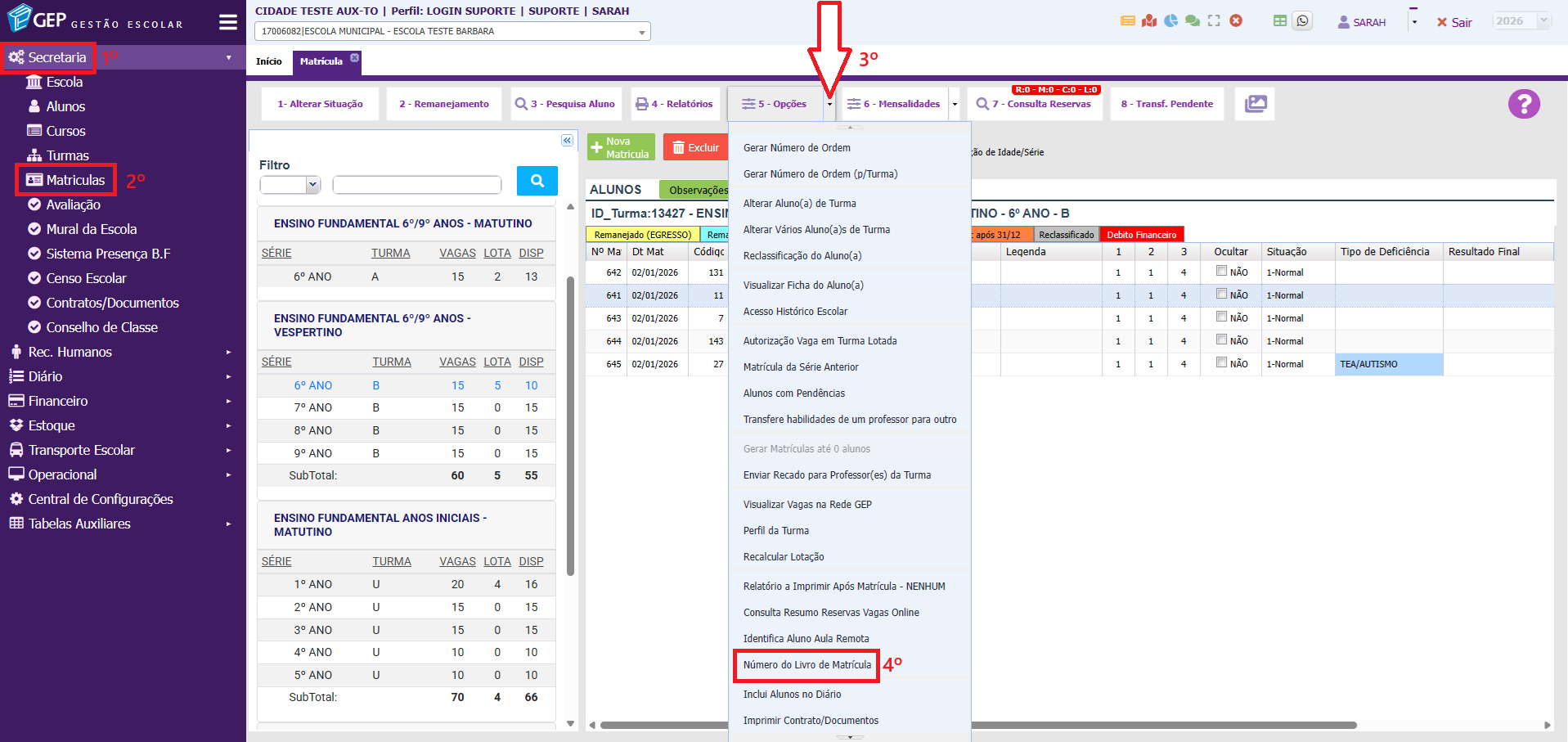 Acompanhe todos os passos abaixo e veja como informar o número do livro de matrícula, no GEP existem dois locais onde inserir a informação.