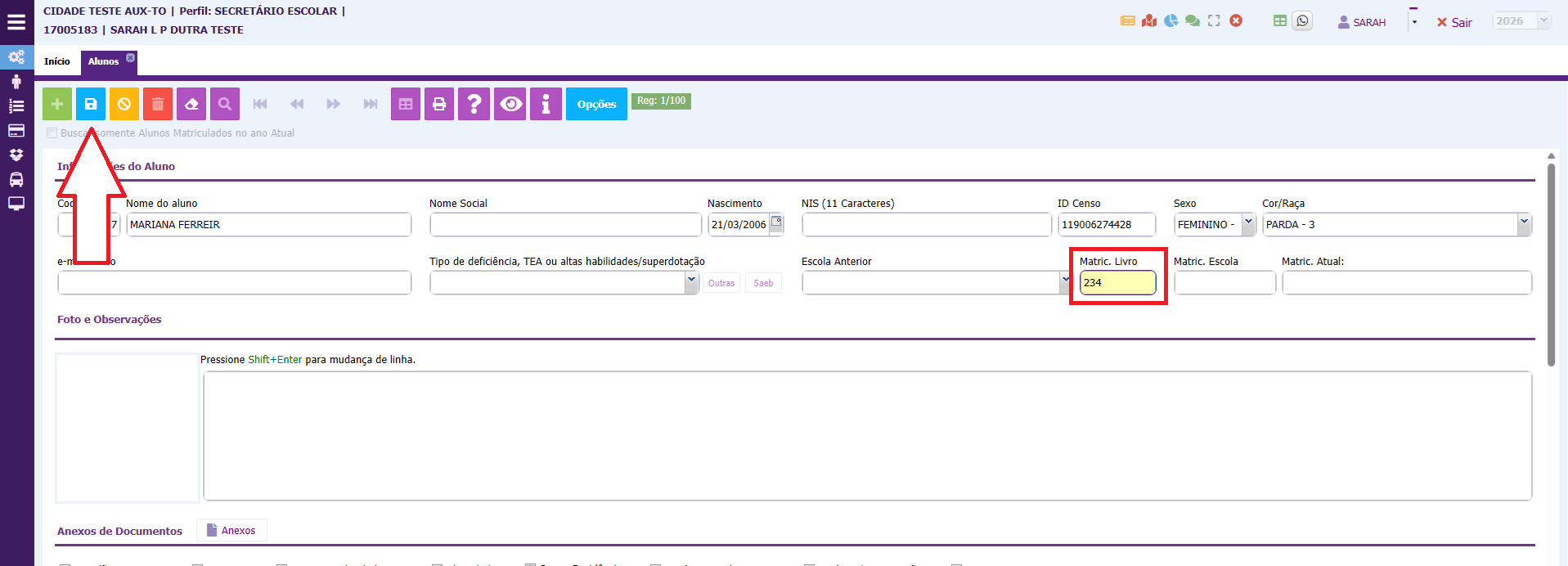 2. Após localizar o cadastro do aluno, digite o número no campo destacado abaixo e depois salve no botão