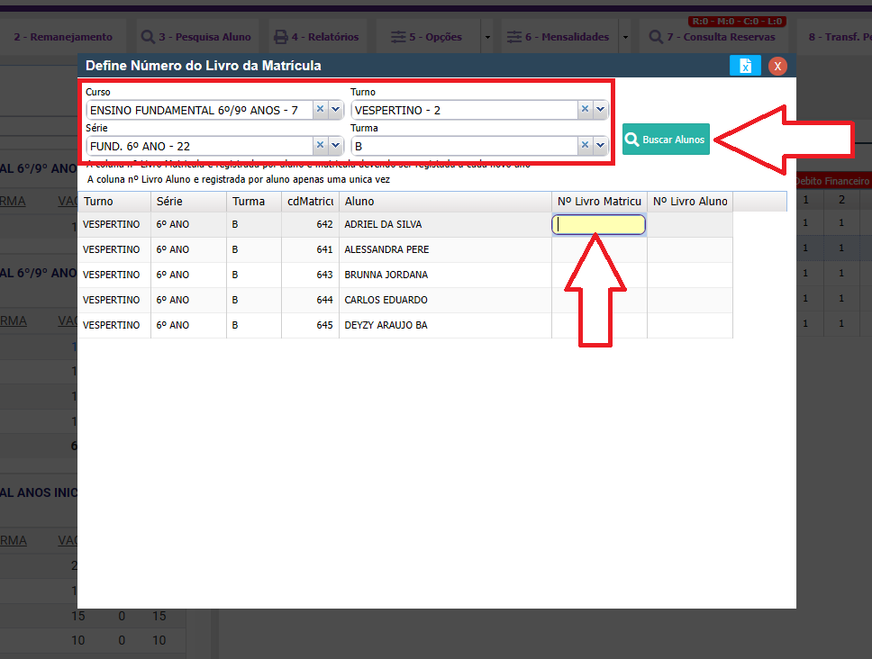 2. Após abrir a janela, você pode clicar no botão BUSCAR ALUNOS e confirmar a mensagem, assim, irá listar todos os alunos matriculados. Caso queira, você também pode filtrar as informações destacadas abaixo e buscar apenas da turma que você deseja. Em seguida, clique no campo referente à coluna Nº livro matriculas e preencha conforme necessário.