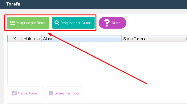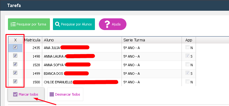 5. Após pesquisar a turma, selecione o(s) aluno(s), marque a coluna indicada abaixo, ou utilize o botão Marcar todos;