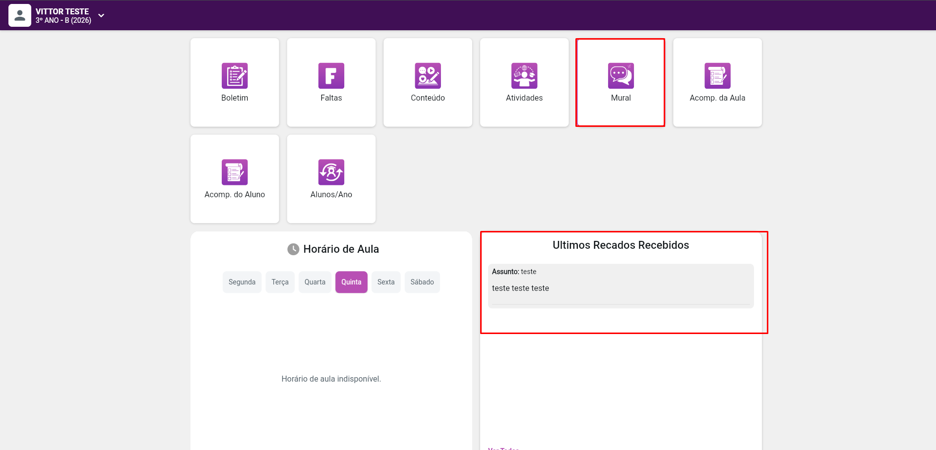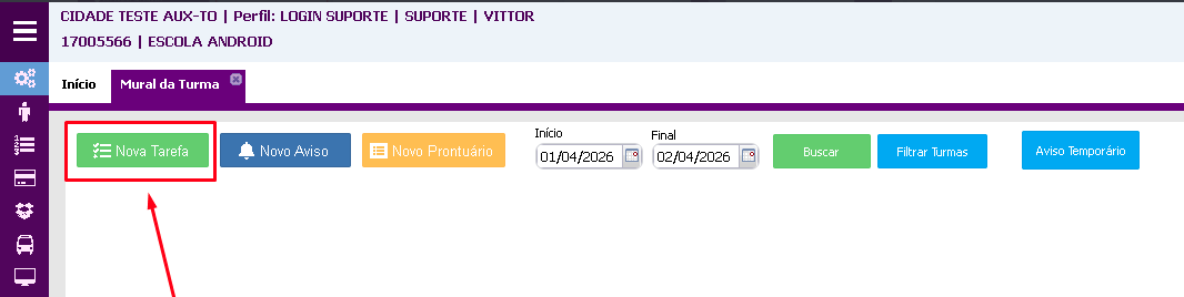 Trata-se do mesmo módulo; a única diferença é que o mural da escola aparece para os usuários da secretaria, onde é possível fazer o envio de tarefas para todos os alunos da escola de uma só vez. Em contraste, o mural da turma só é visível para o professor, exibindo apenas as turmas das quais ele é responsável, ou seja, ele só pode enviar mensagens para os alunos de sua turma.