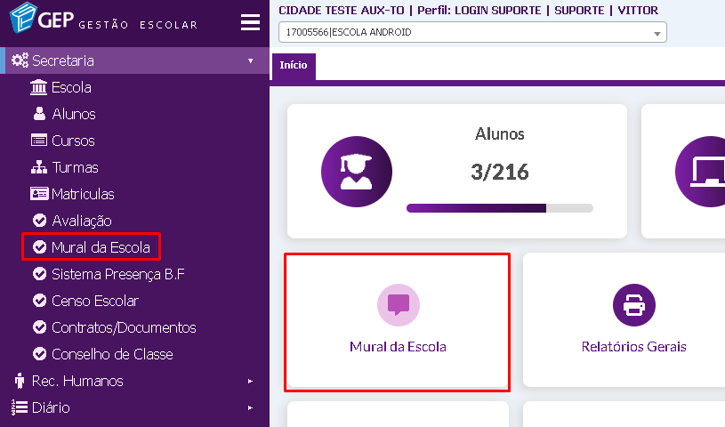 1. Inicialmente abra o sistema com seu usuário, na página inicial selecione o modulo Mural da Turma/Mural da Escola ou clique em Secretaria -> Mural da Turma/Mural da Escola .