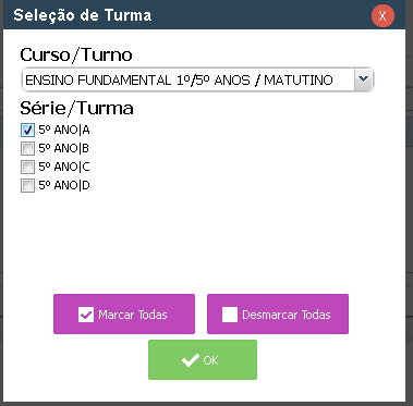 4. Selecionamos Pesquisa por turma, selecione o curso e a turma, depois clique em OK;