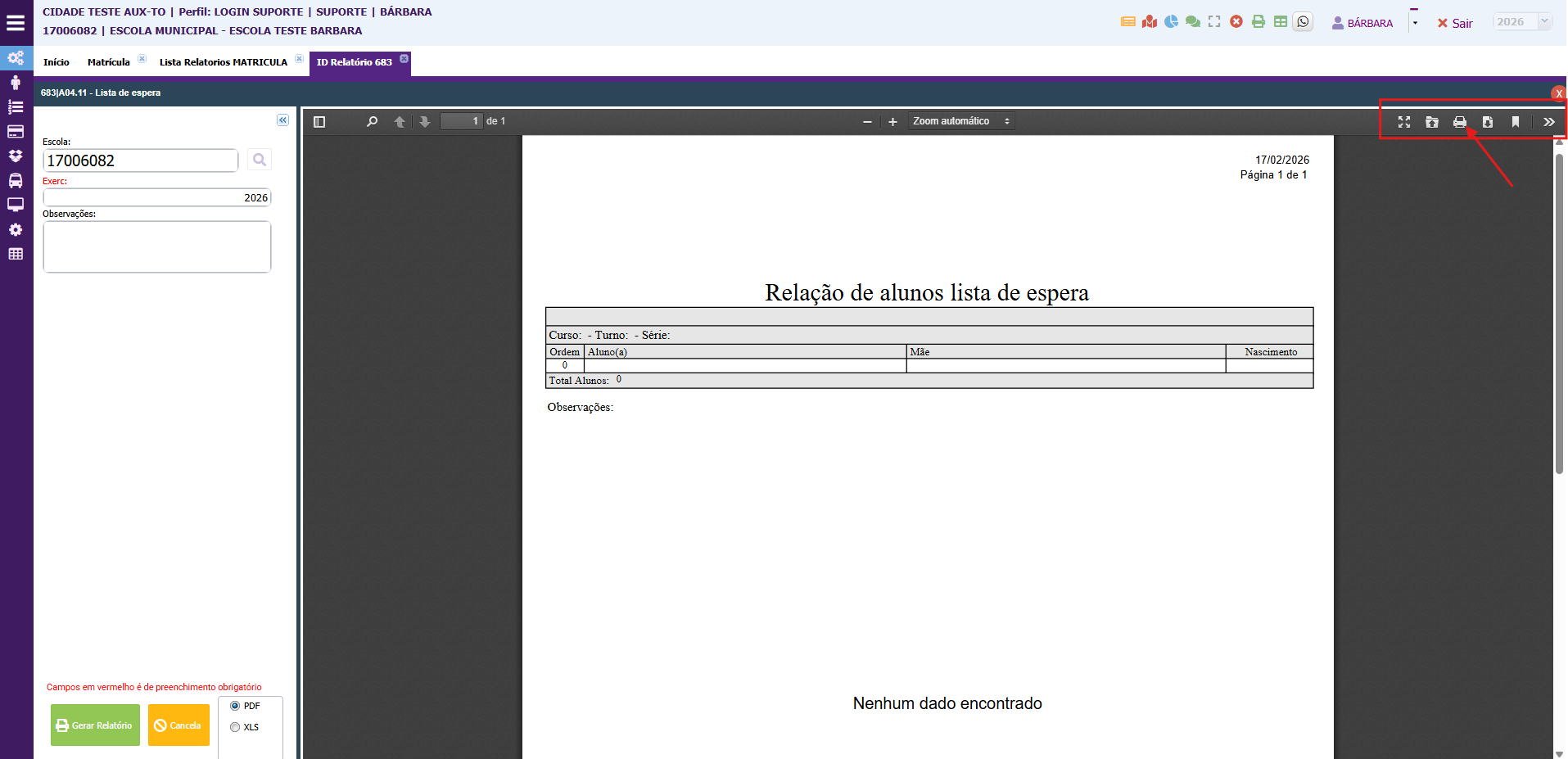O relatório será gerado, sendo possível realizar a sua impressão, clicando no botão