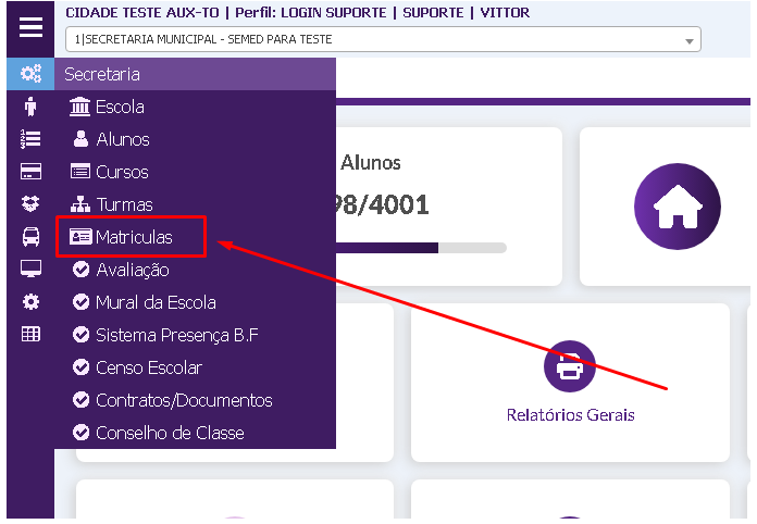 1. Para iniciar vamos abrir o menu Secretaria e selecionar a opção Matriculas.