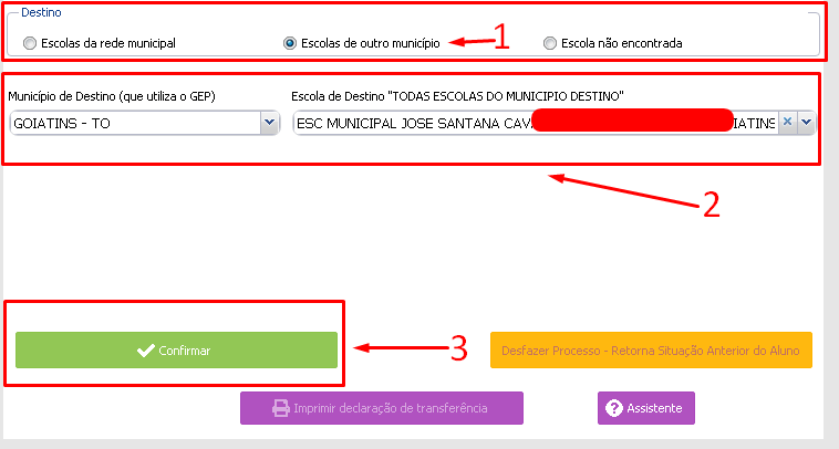 2º - Pesquise o município de destino e a Escola de Destino "que contenha a mesma série de origem";