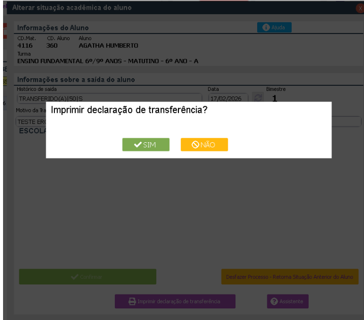 5. Quando o processo for concluído o sistema irá lhe perguntar se deseja imprimir a declaração de transferência, lembrando que para imprimir tal relatório só será possível se o histórico escolar do aluno estiver preenchido, se estiver tudo ok clique em SIM.
