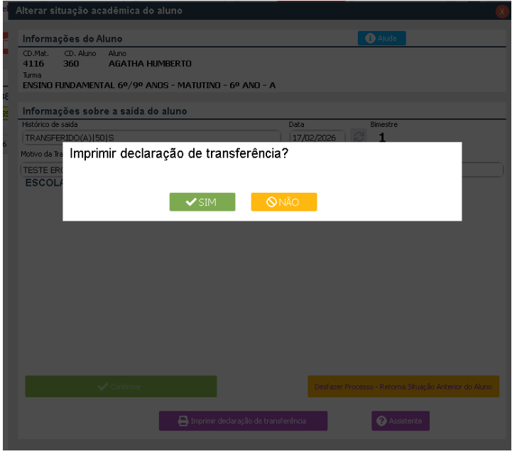 5. Quando o processo for concluído o sistema irá lhe perguntar se deseja imprimir a declaração de transferência, lembrando que para imprimir tal relatório só será possível se o histórico escolar do aluno estiver preenchido, se estiver tudo OK clique em SIM.