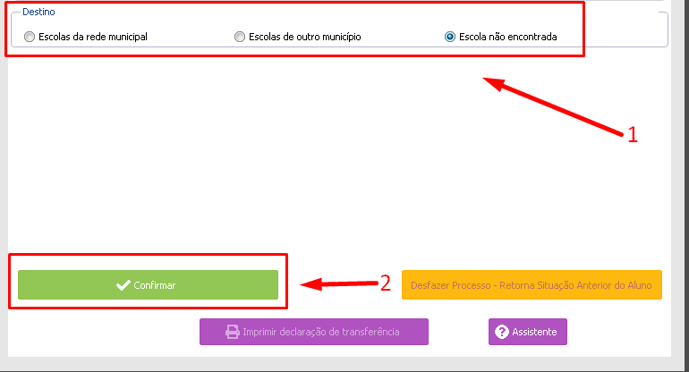 4. Como o aluno será transferido para uma escola onde não possui o sistema GEP ou uma escola de destino não informada, daremos continuidade ao processo selecionando: