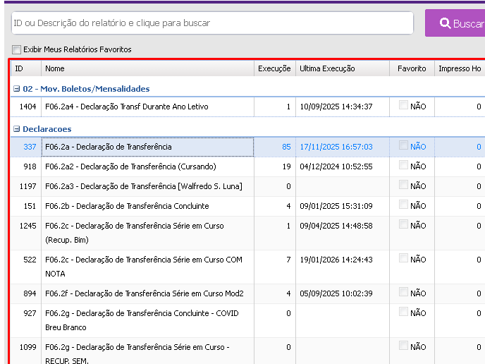 6. Selecione o relatório de declaração ideal para sua transferência e clique em OK, assim o relatório será gerado.